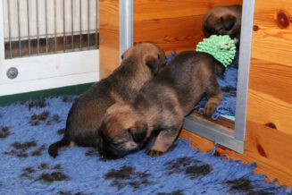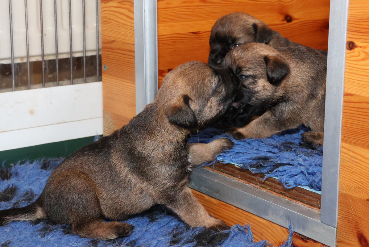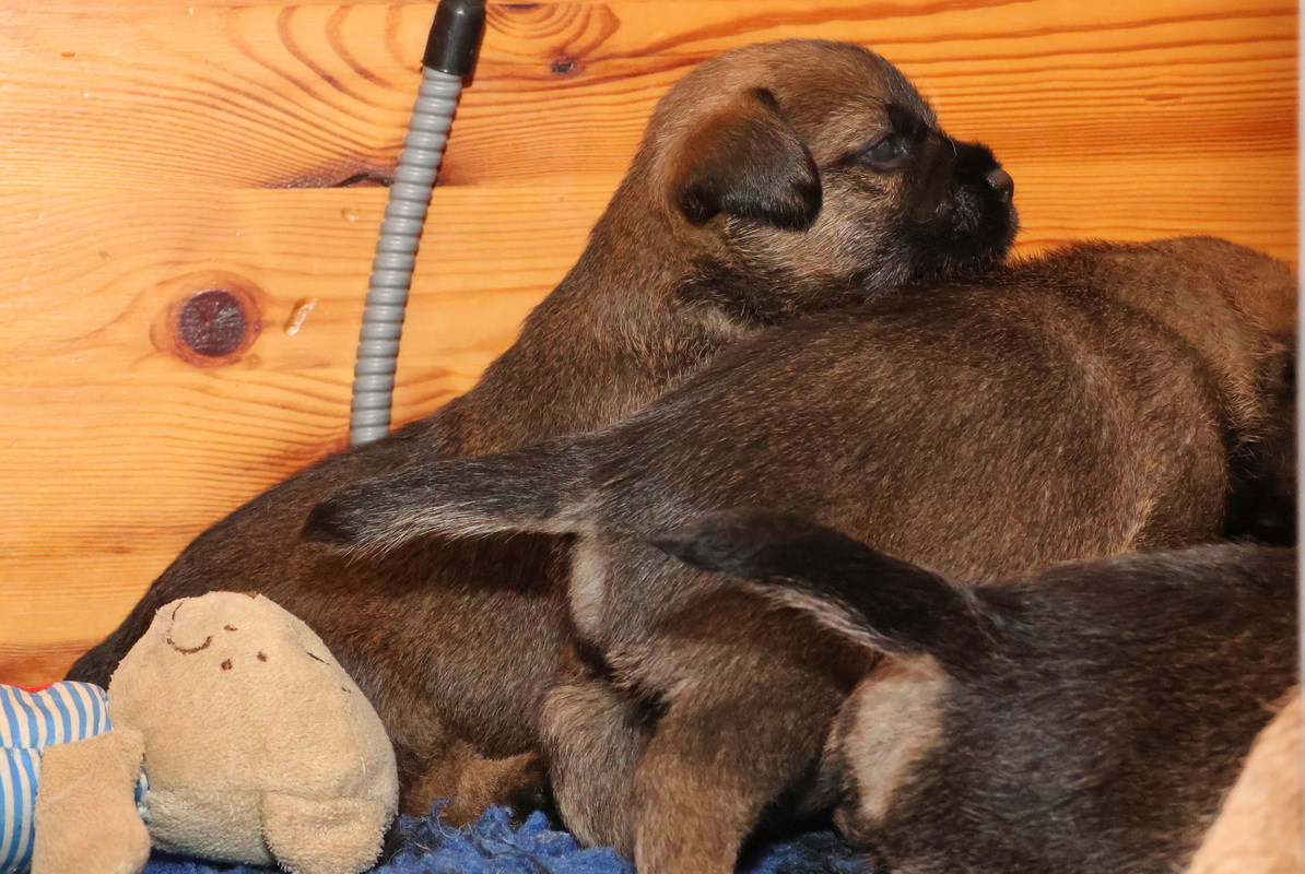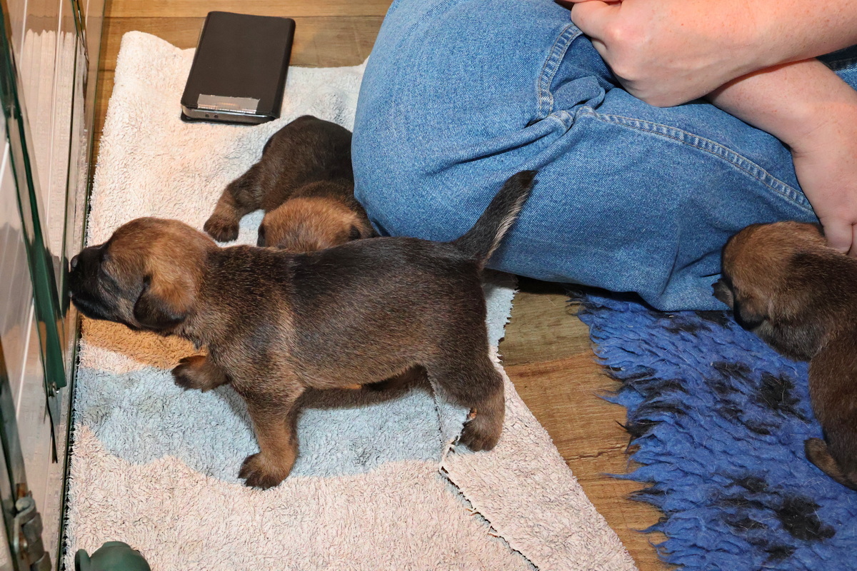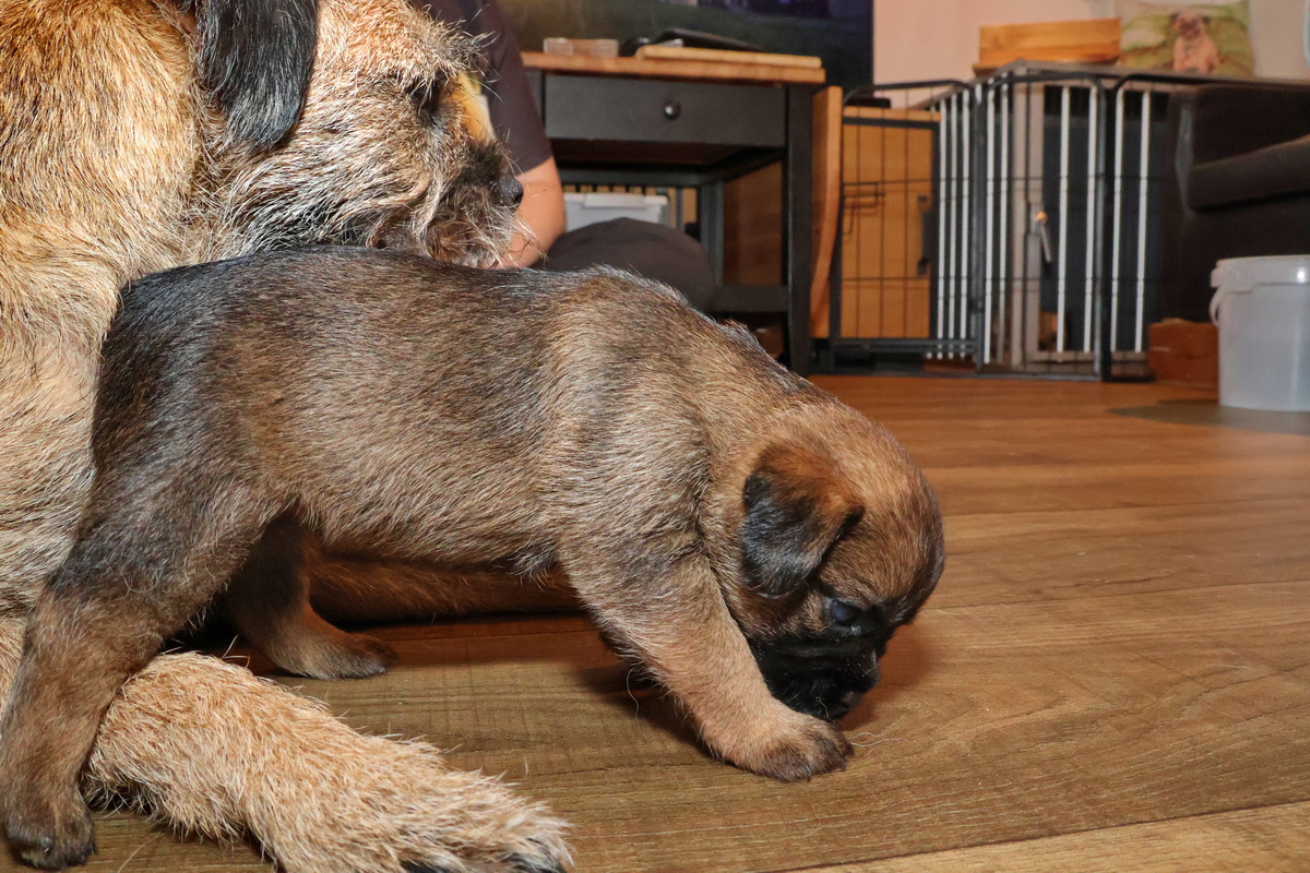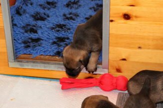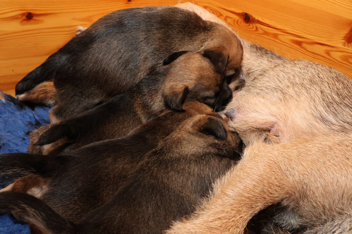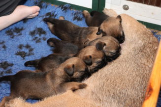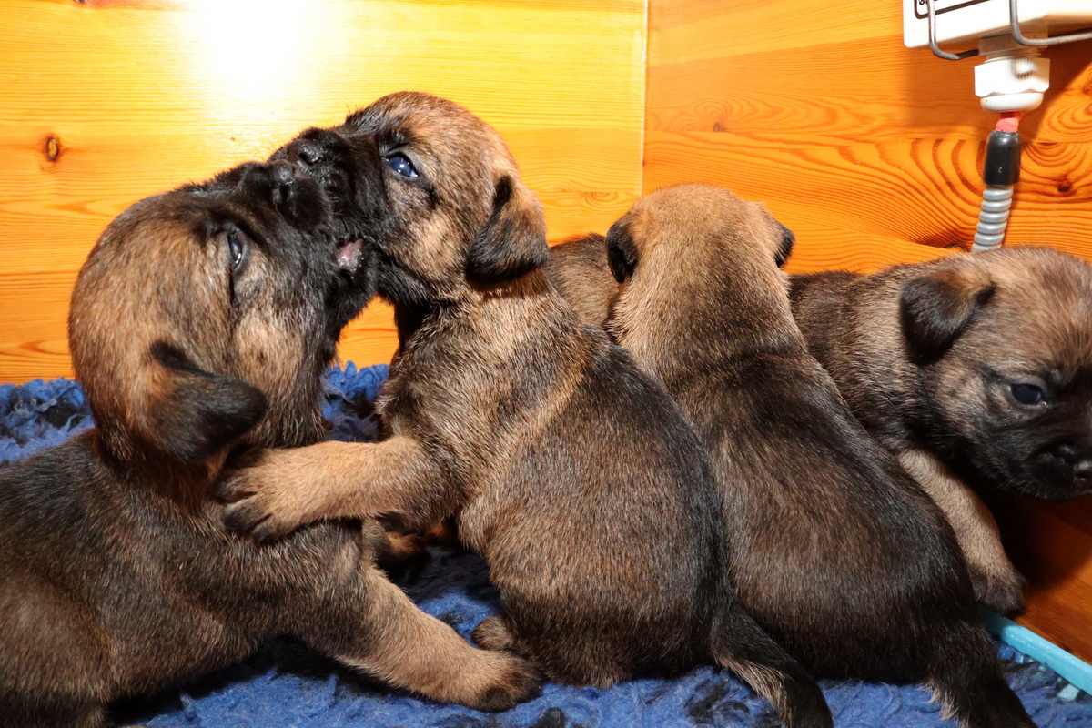 De puppy’s zijn elke keer wat langer wakker.  Ze gaan dan lekker in de werpkist of de kamerkennel spelen. En natuurlijk om de drie uur even bij Rosie langs voor wat lekkers.