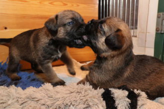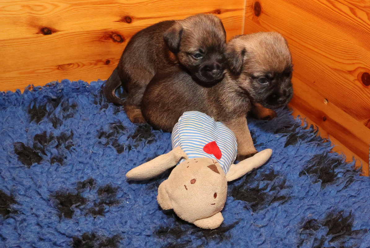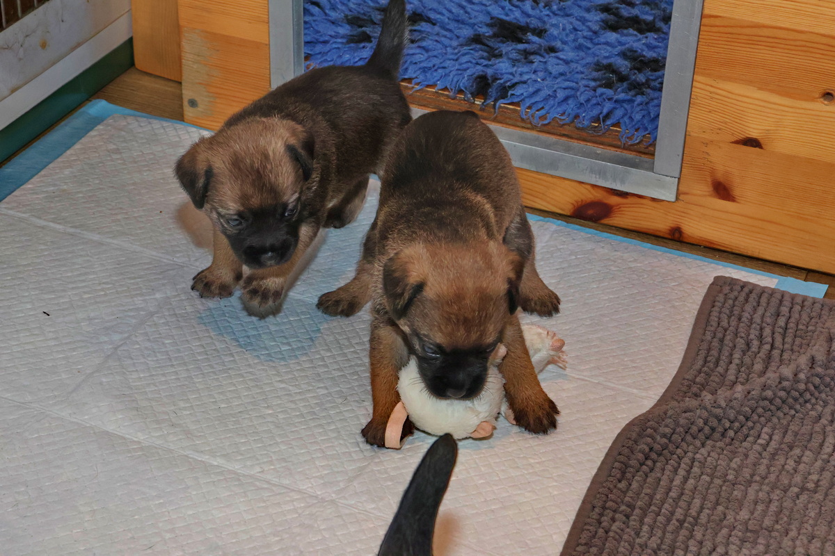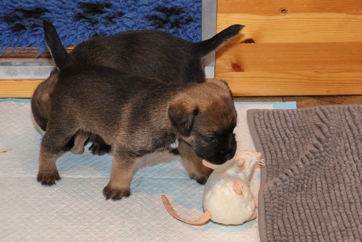 Als je kijkt hoe ze met de speelgoed muis omgaan, zie je het terriër karakter al naar boven komen.