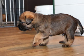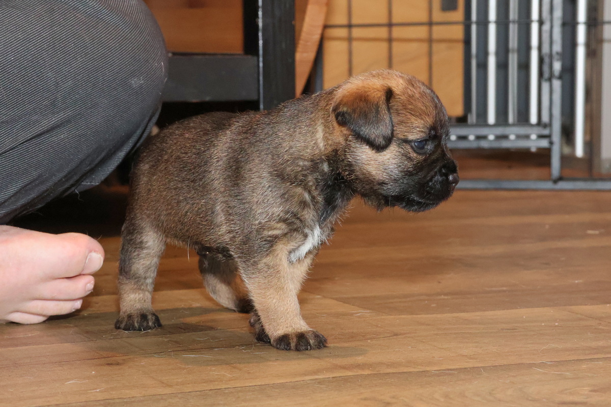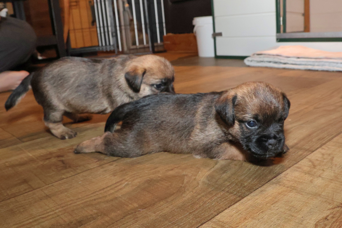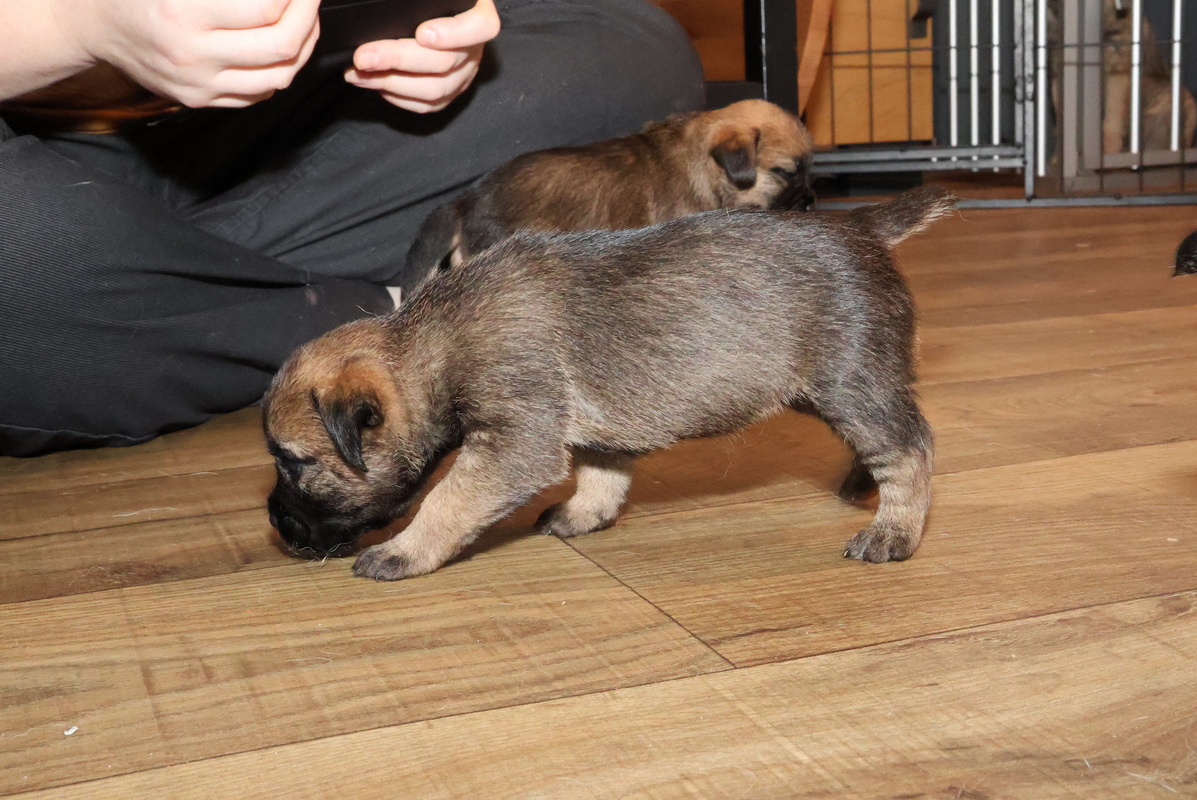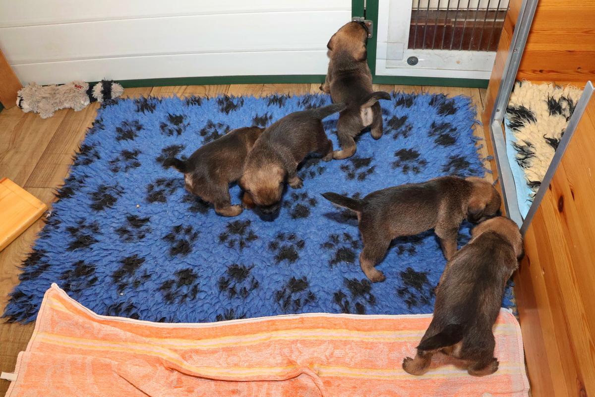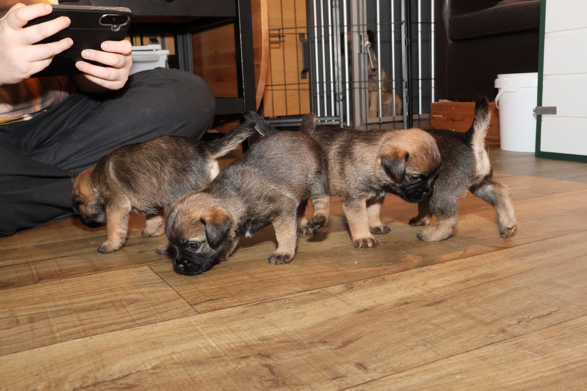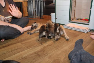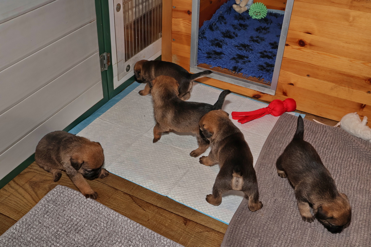 Nu de pups goed kunnen lopen en ze de hele kamerkennel al kennen, werd het tijd voor de volgende stap: de kamerkennel uit en de woonkamer in. We hebben een deel van de zithoek met hekjes afgesloten, waardoor ze niet op (voor puppy’s) gevaarlijke plaatsen kunnen komen. Maar ze houden meer dan voldoende ruimte over om zich lekker uit te leven.
