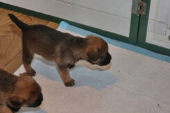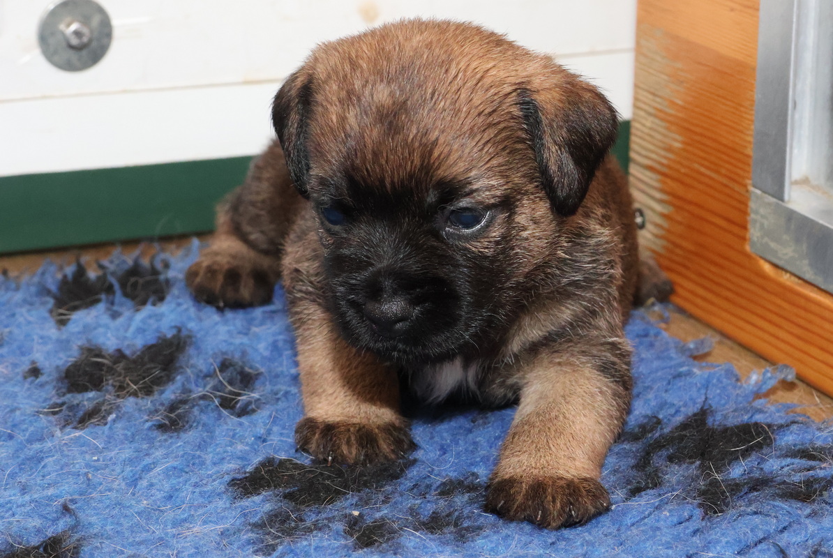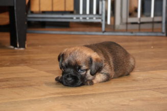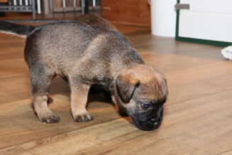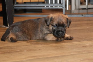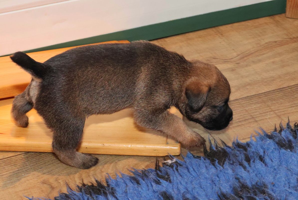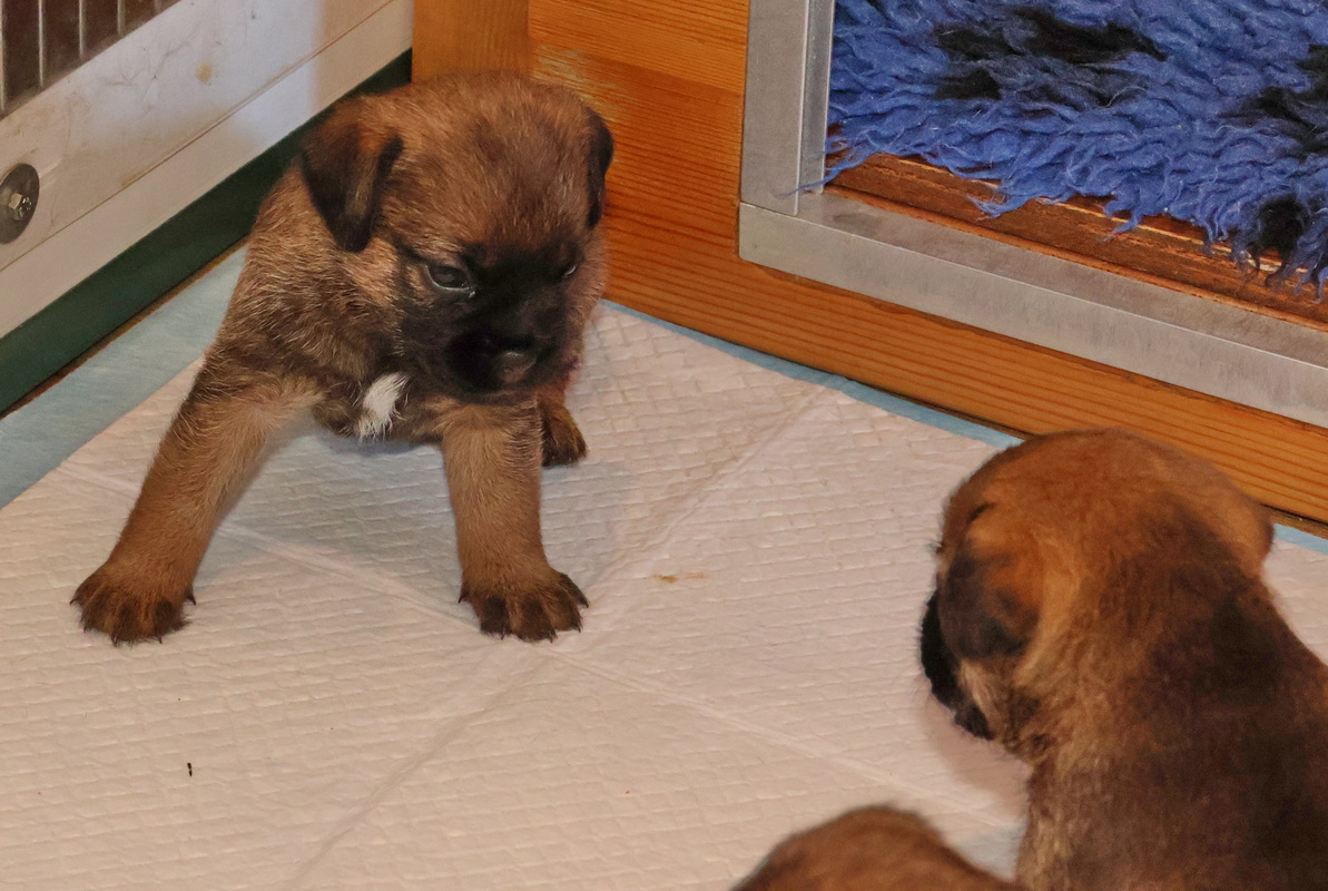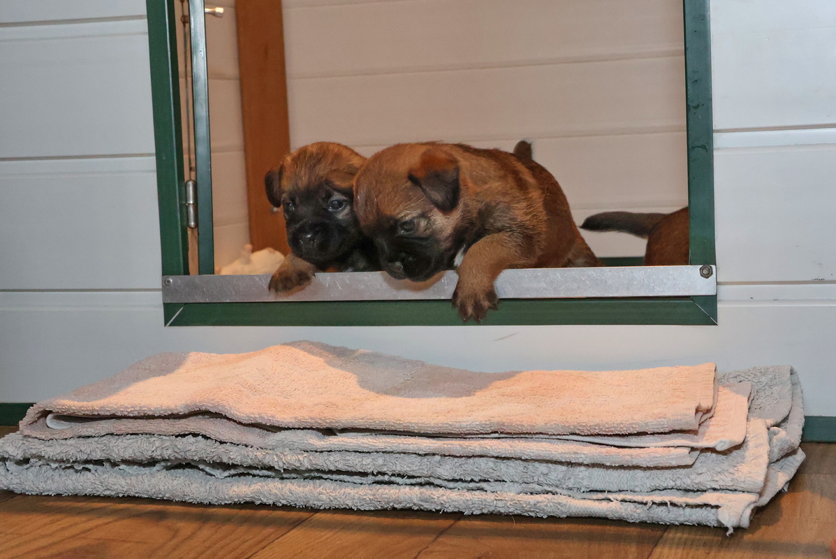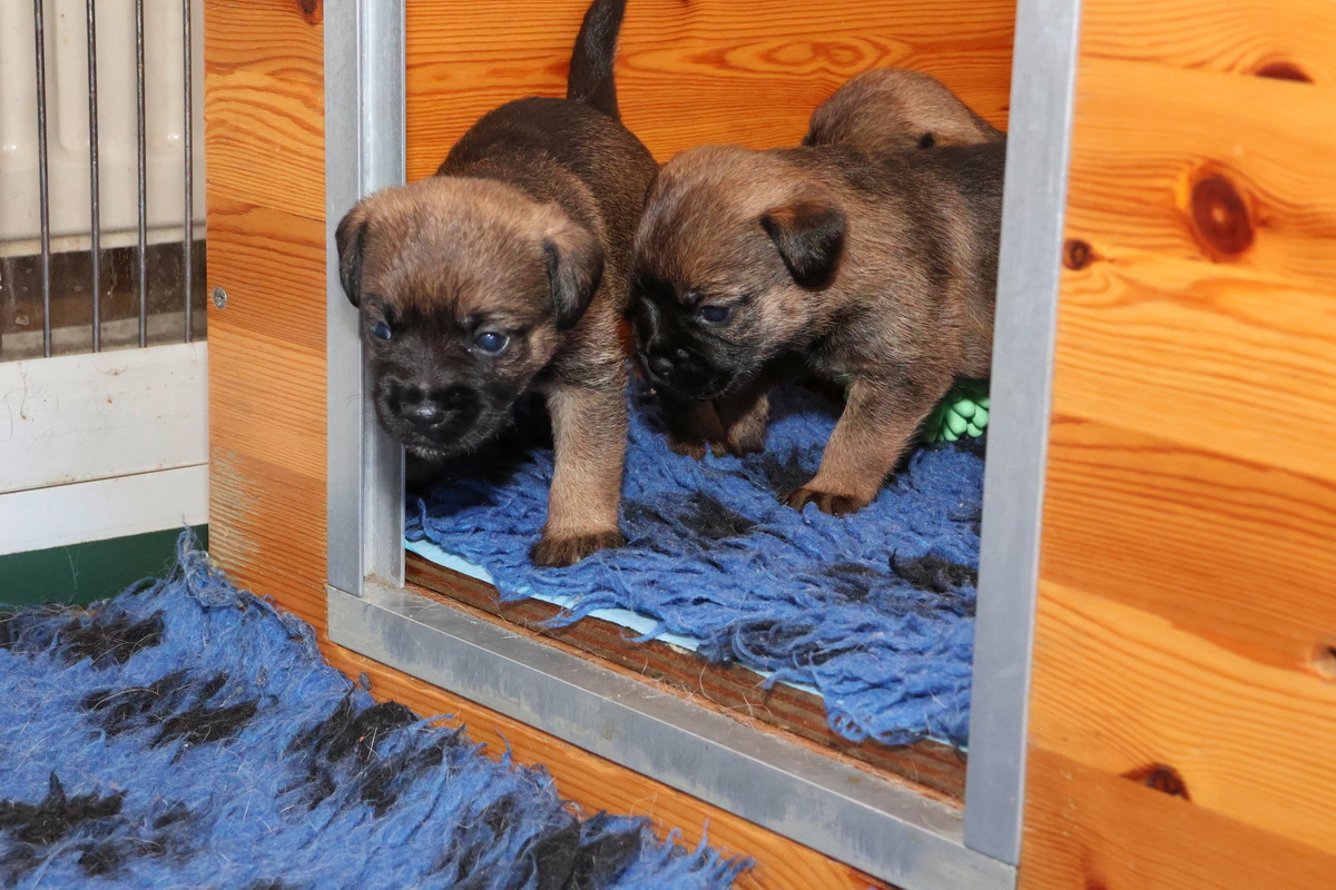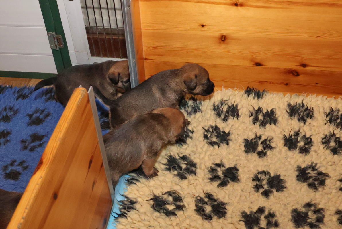Vandaag mochten de puppy’s voor de eerste keer vanuit de werpkist de kamerkennel in. Dat vonden ze leuk! Zodra de plankjes voor de ingang van de werpkist eruit waren stond de eerste al klaar om de grotere wereld te gaan verkennen. Twee gingen als eersten echt eruit. Toen ze even gekeken hadden gingen ze de anderen halen, onder toeziend oog van Rosie.