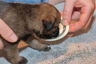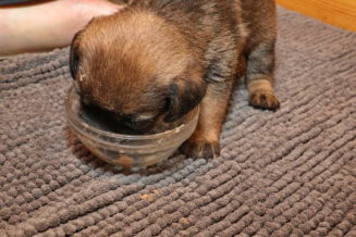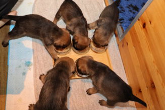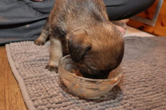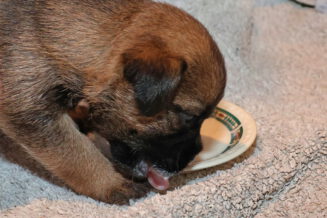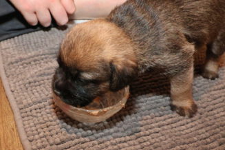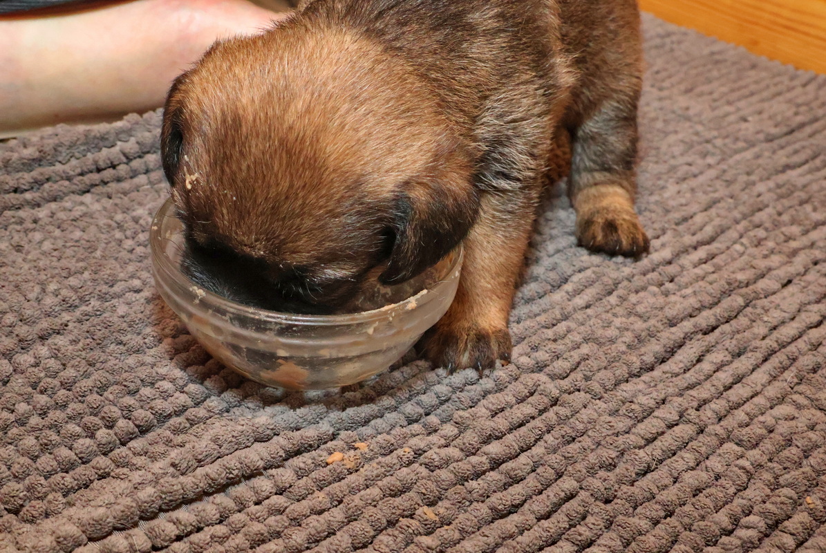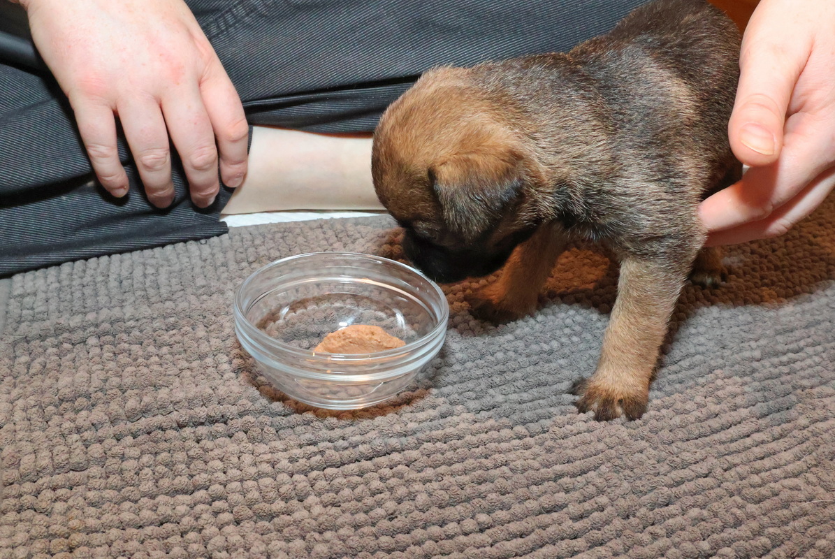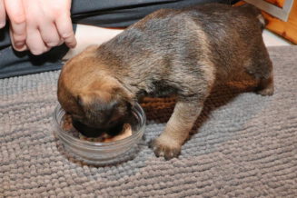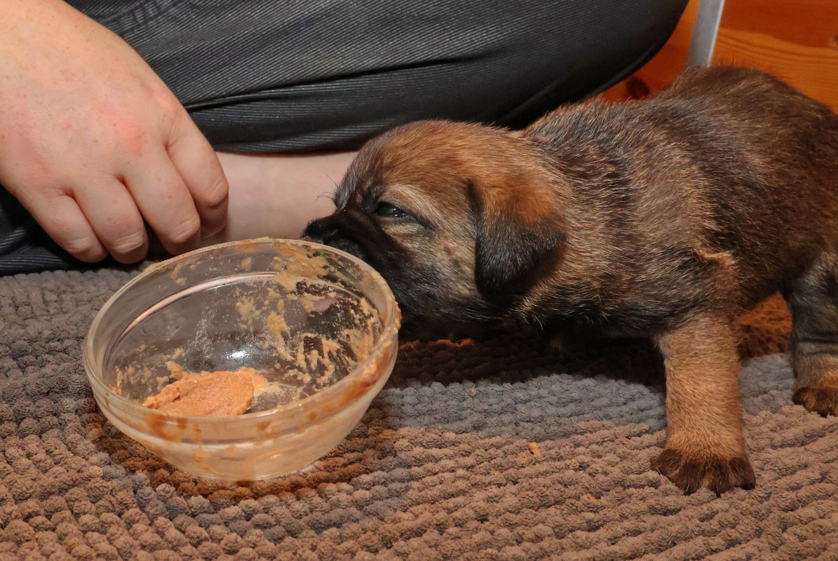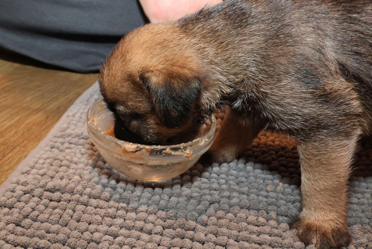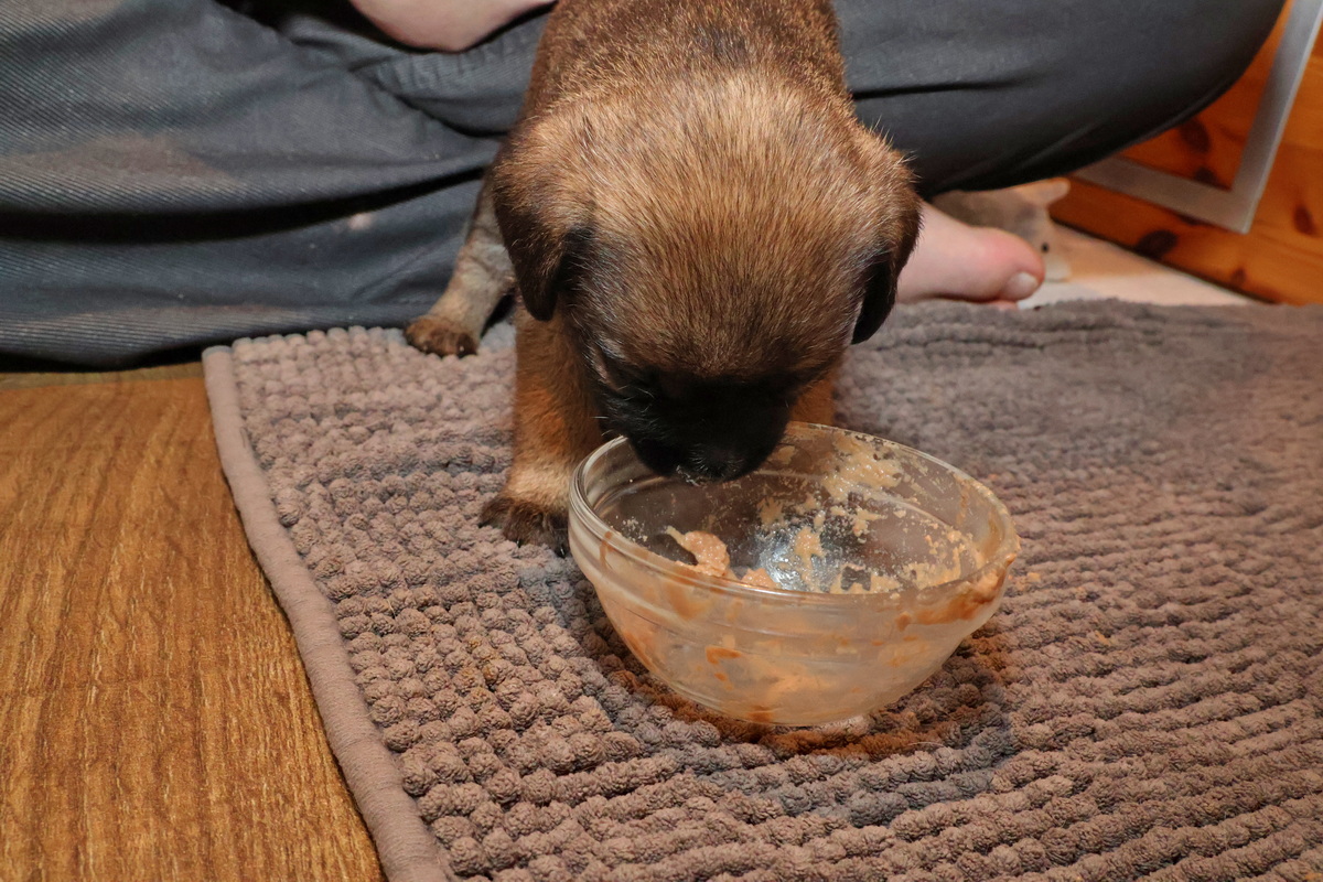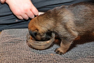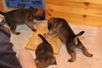 De puppy’s waren al gewend om puppymelk van een schoteltje te drinken. Daarna hebben we eerst wat rijstebloem aan de melk toegevoegd om ze aan dikker voer te laten wennen. Die pap vonden ze nog lekkerder dan de melk, dus de schoteltjes met pap waren dan ook snel helemaal leeg. En Rosie zorgde er natuurlijk voor dat de puppy’s weer schoon naar bed gingen.