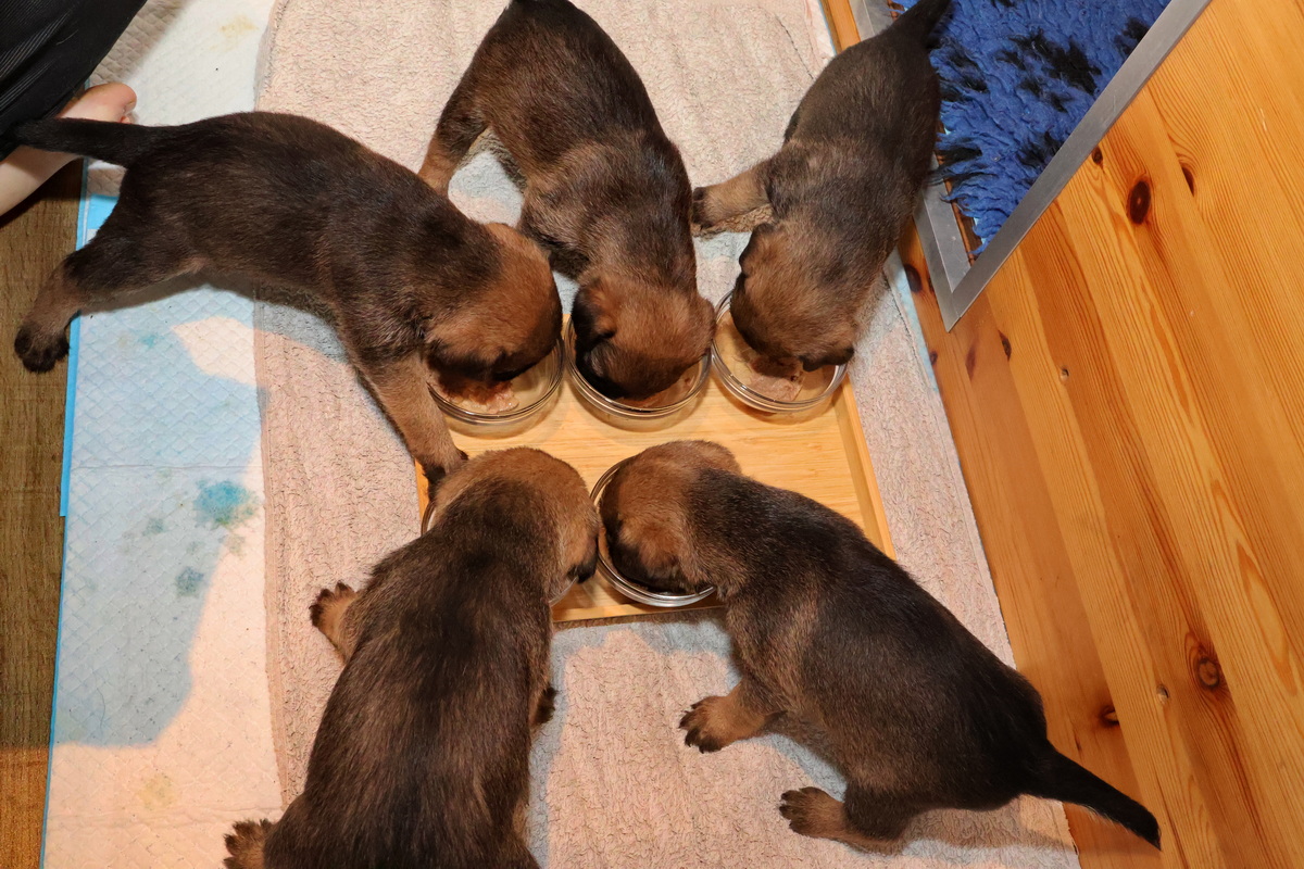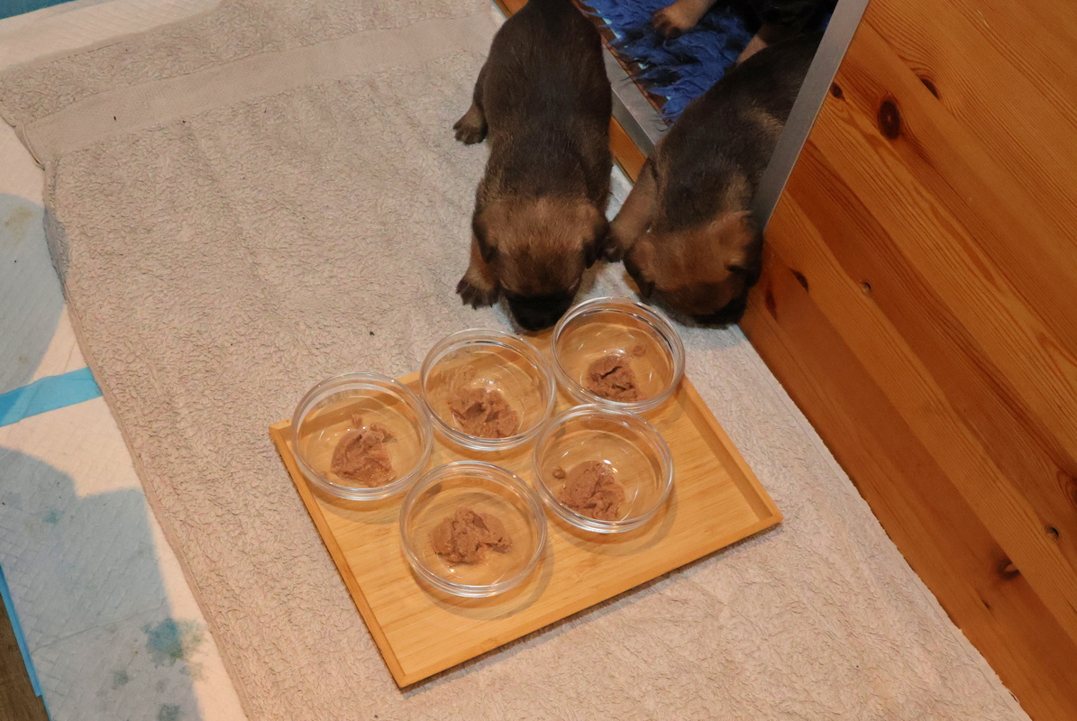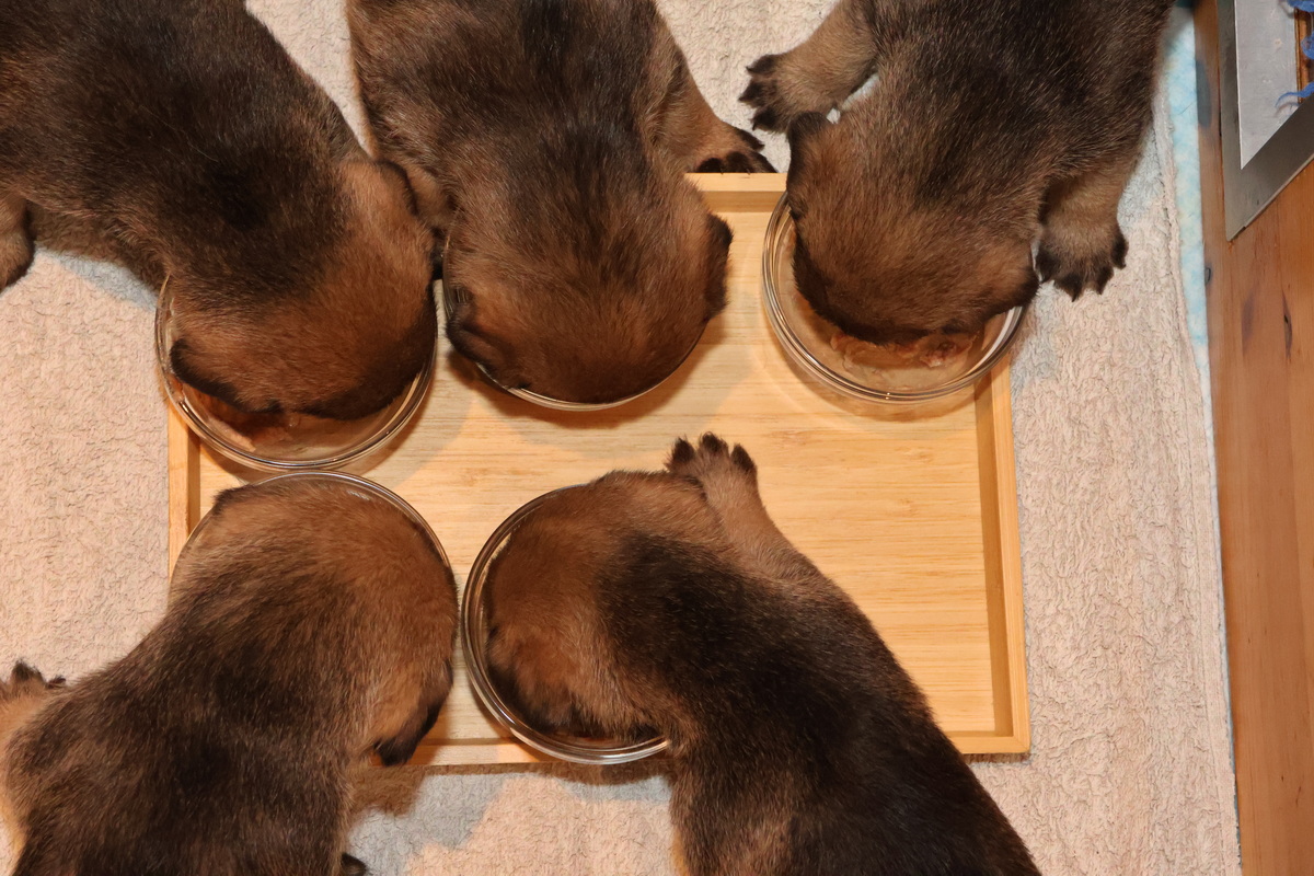 Nu de puppy’s gewend zijn aan de mousse eten ze gezellig samen. Als het blad met vijf bakjes wordt neergezet, komen ze snel de werpkist uit om zo snel mogelijk te gaan eten. En ze helpen elkaar met de afwas!
