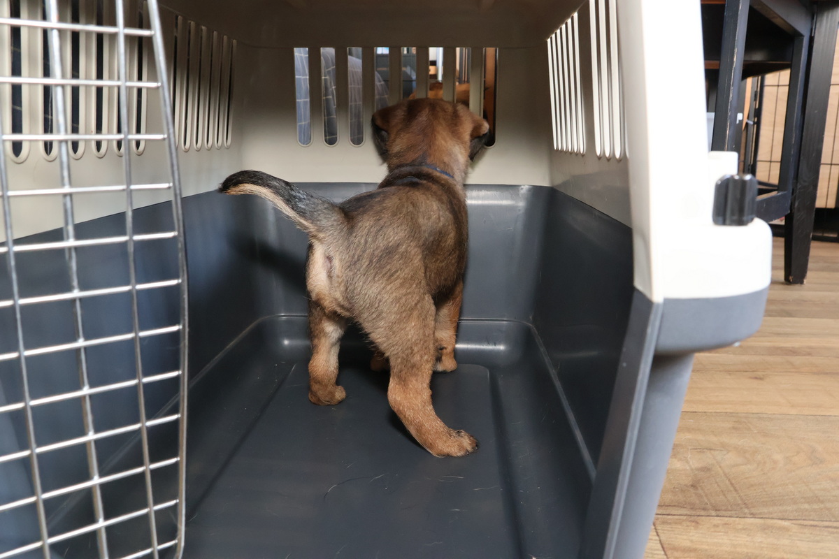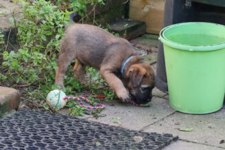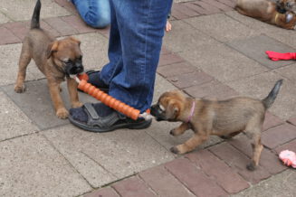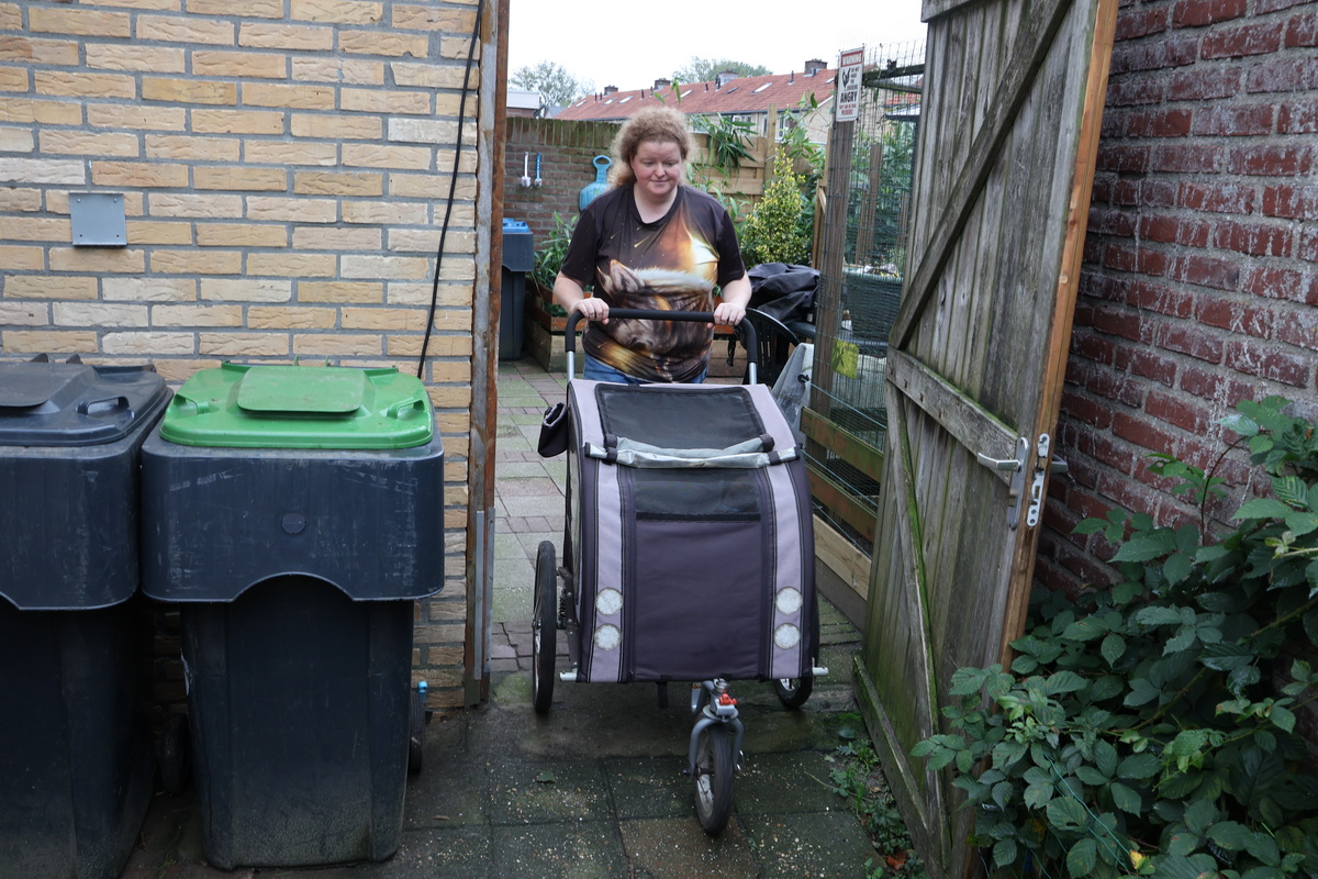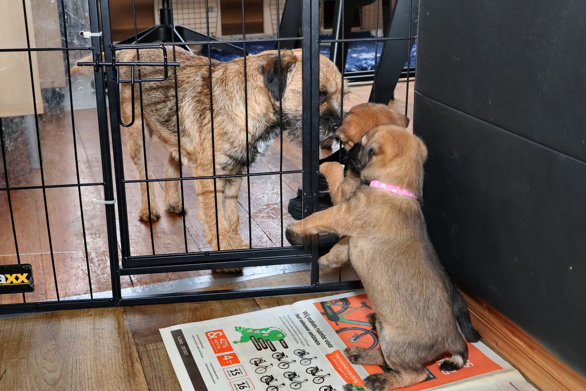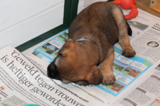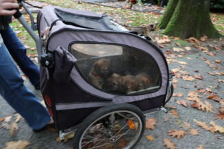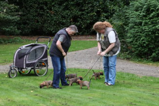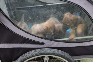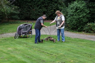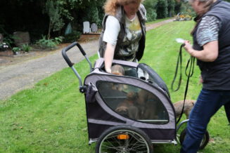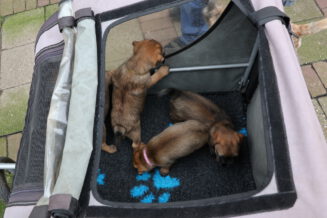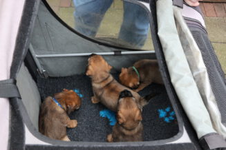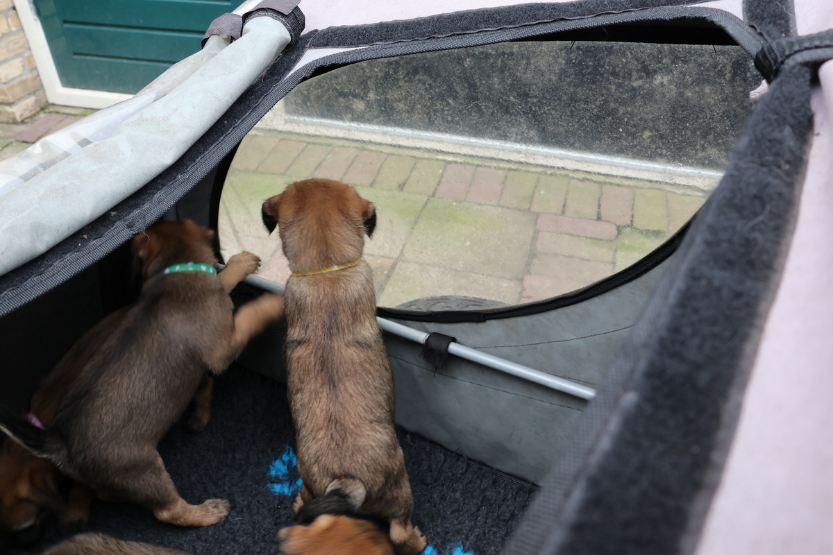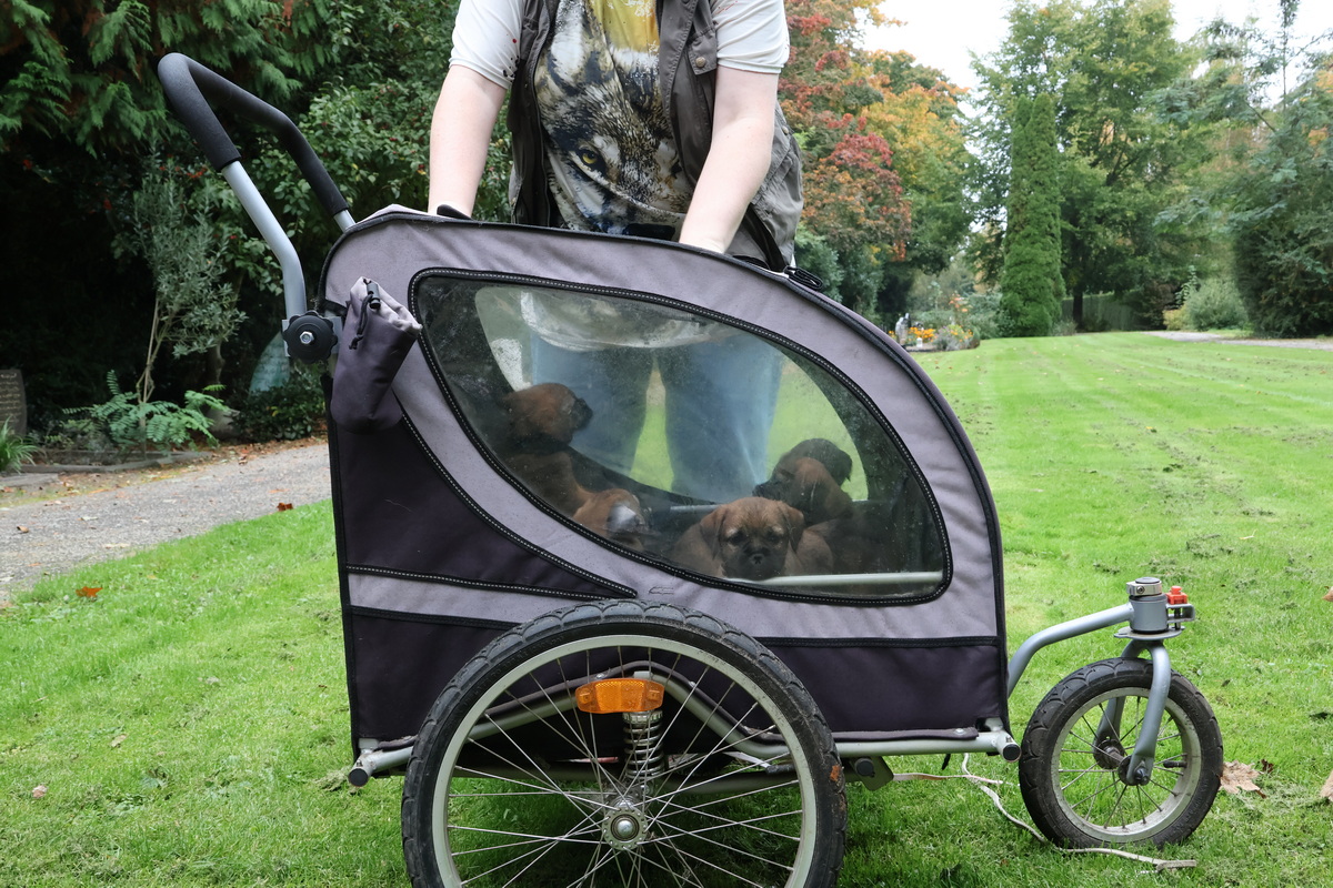 Wij gebruiken altijd het fiets/wandel karretje als we met de pups wat gaan doen. De eerste keer is het maar een klein stukje, gewoon om de puppy’s te laten wennen.