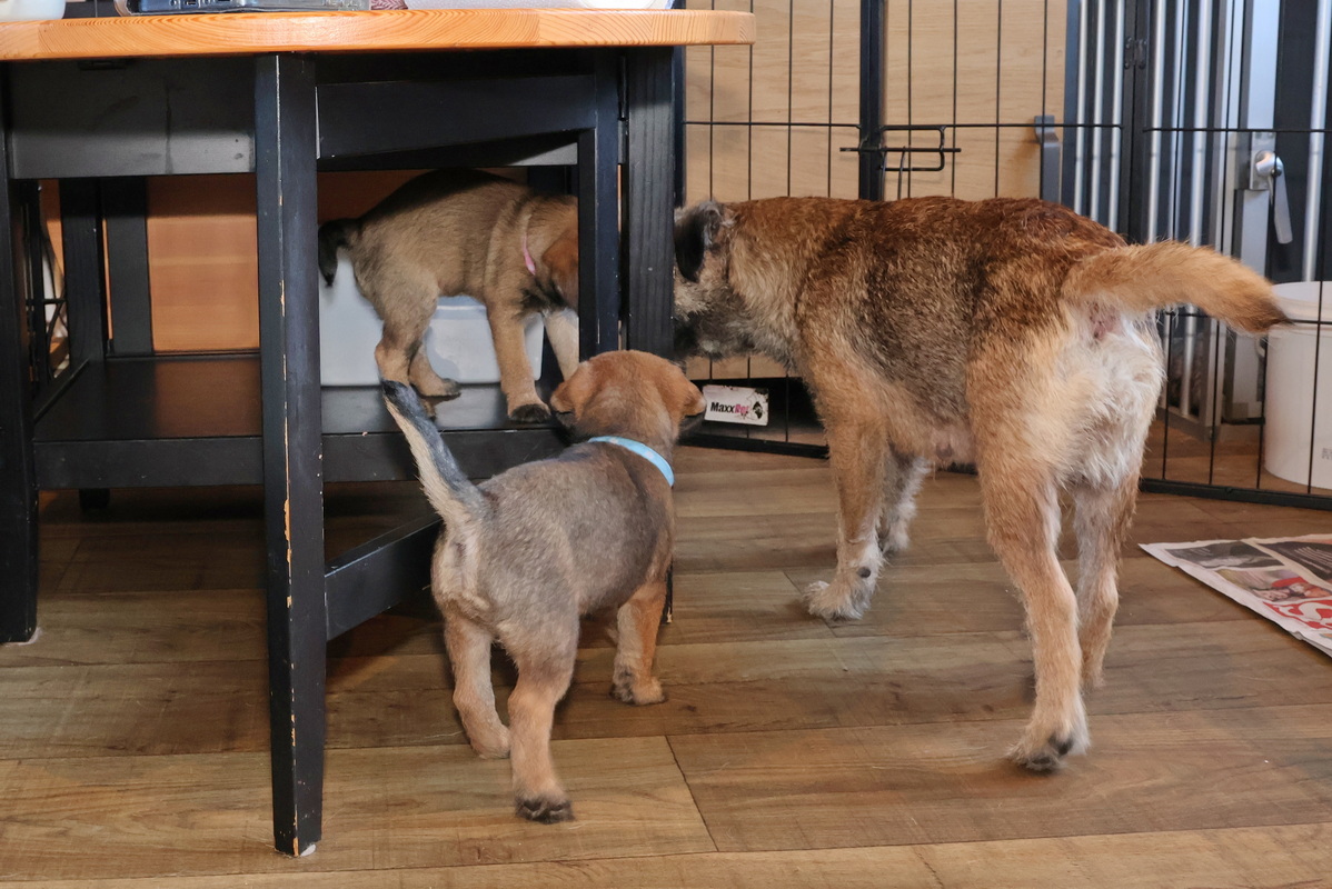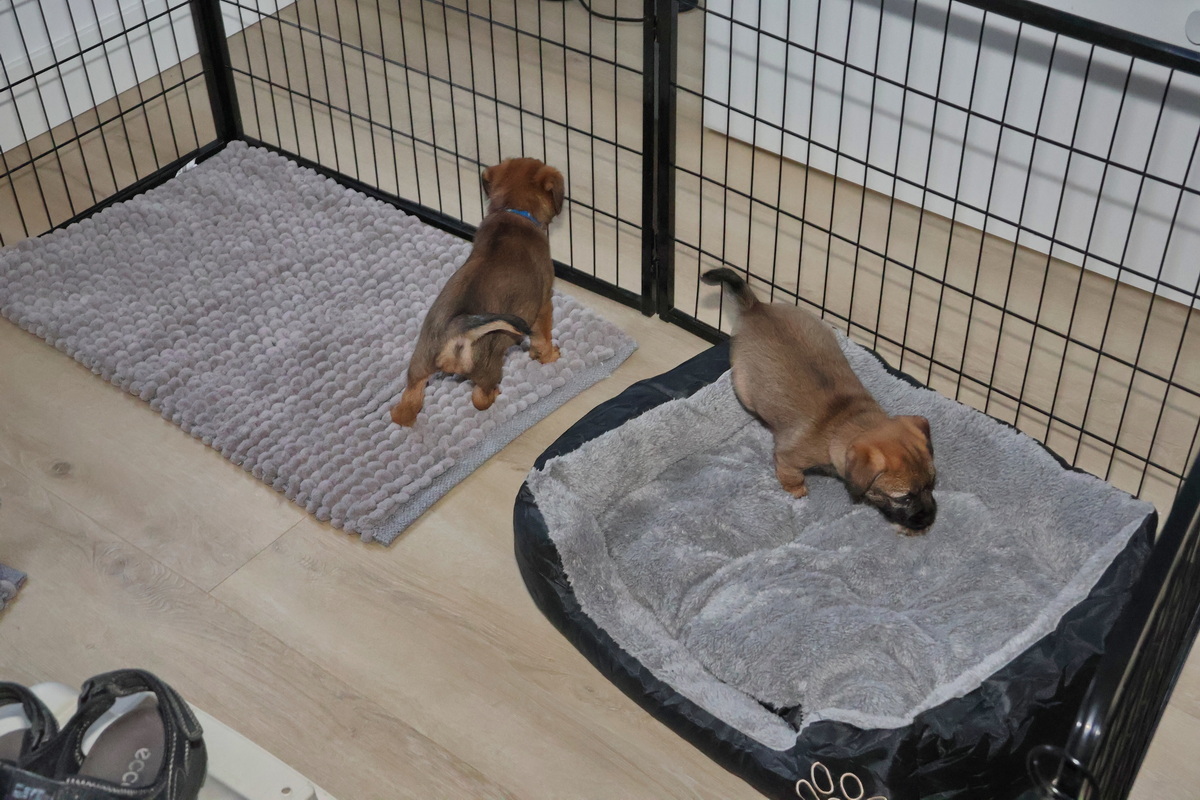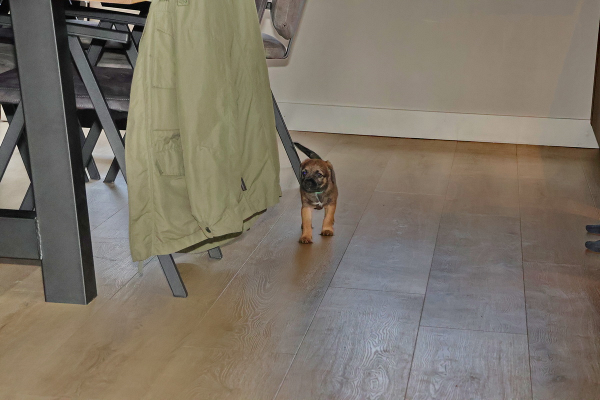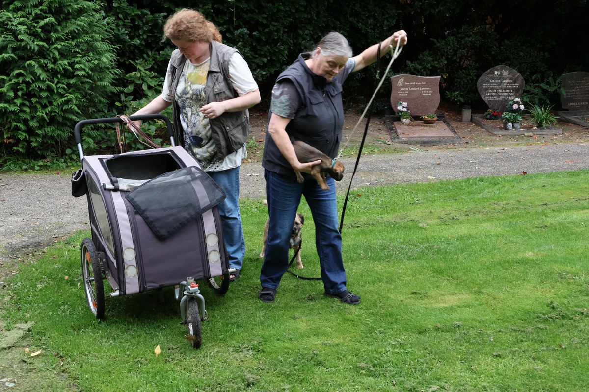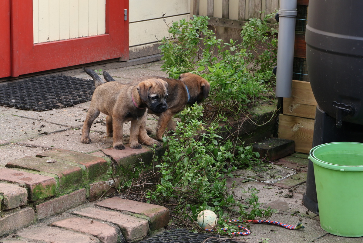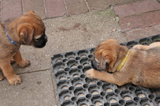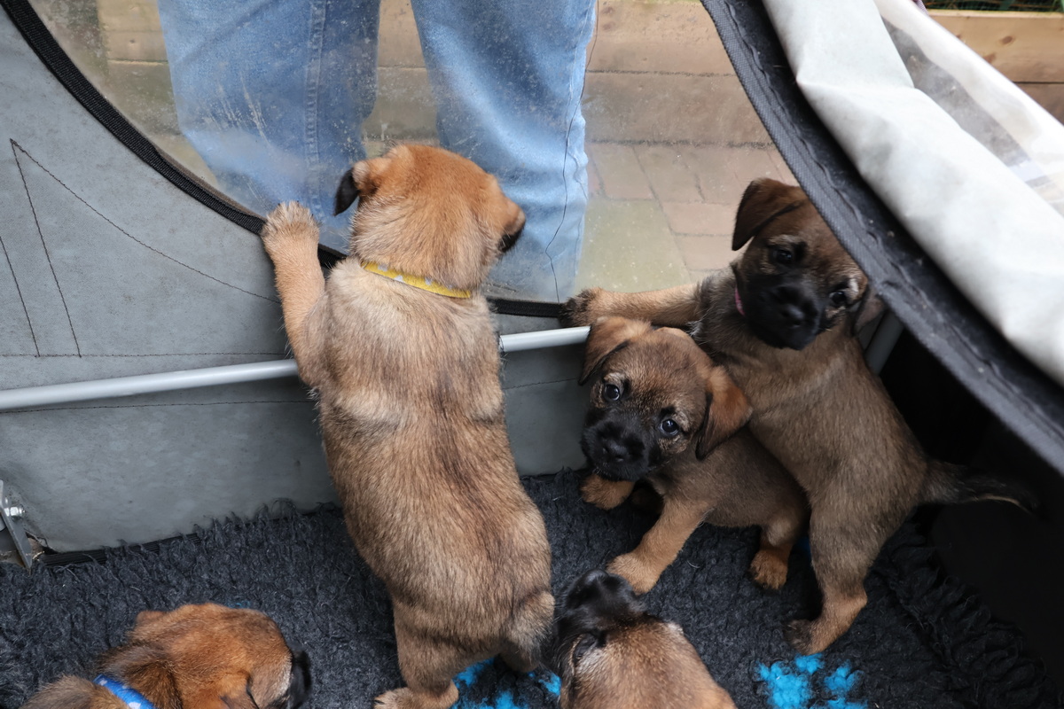 Wij gebruiken altijd het fiets/wandel karretje als we met de pups wat gaan doen. De eerste keer is het maar een klein stukje, gewoon om de puppy’s te laten wennen.
