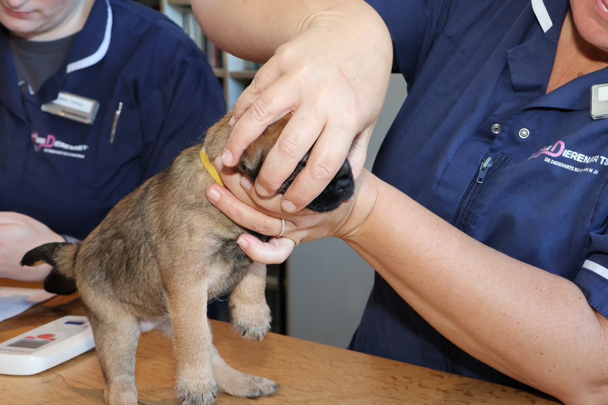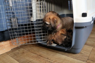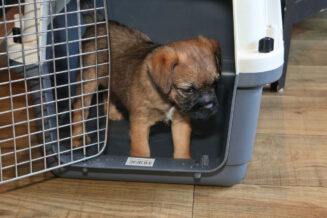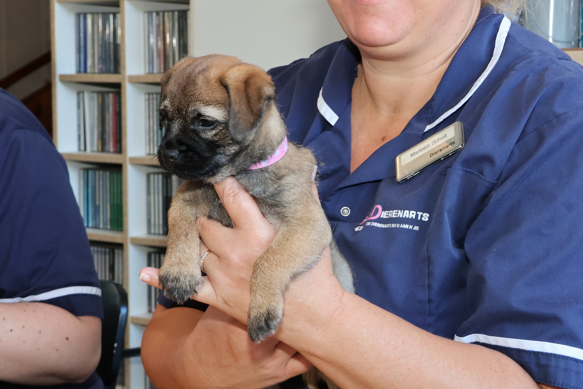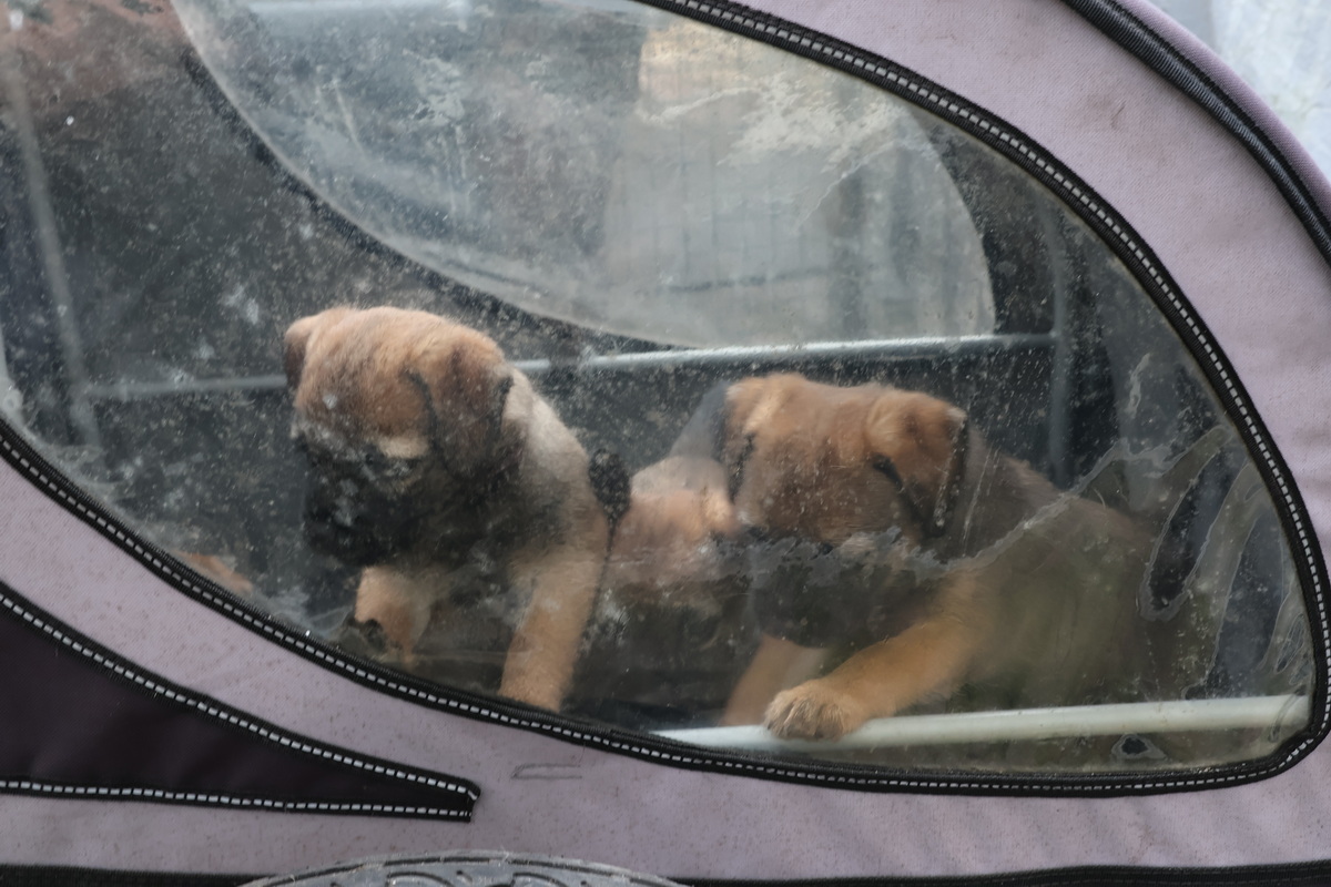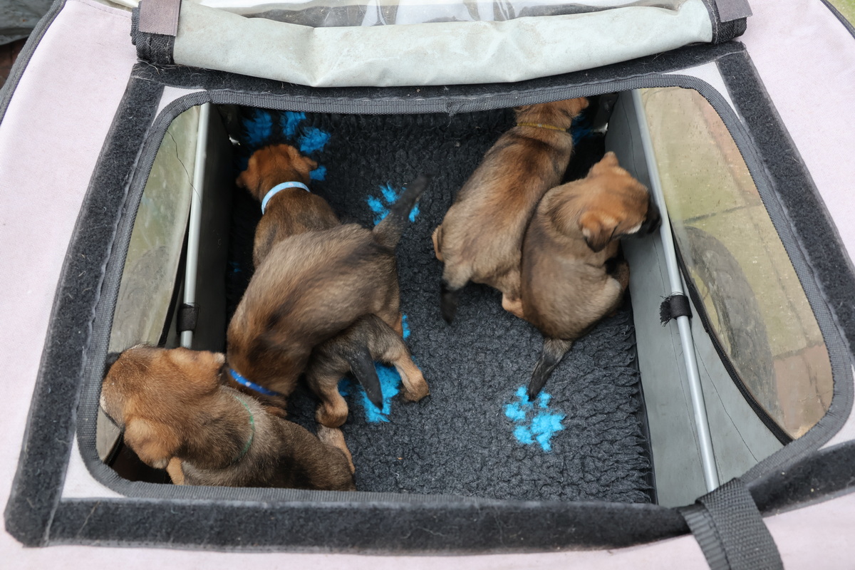 De puppy’s vonden het ritje best leuk. Ze zaten voor de raampjes te kijken naar de grote mensen wereld. Ze bleven vrij rustig en waren helemaal niet angstig of onrustig.